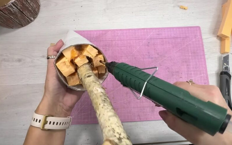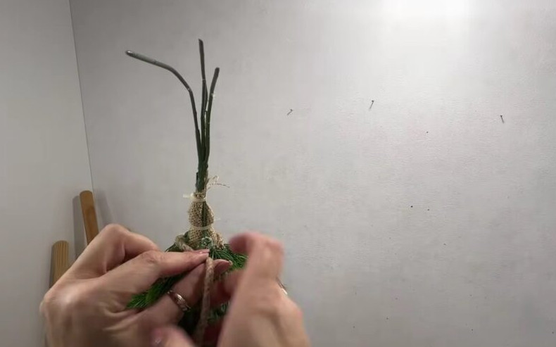Закрепите ветку на конусе, используйте кусочки пеноплекса для дополнительной прочности.
