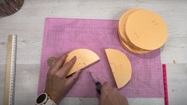Подготовленные круги из пеноплекса разрежьте пополам и сделайте отверстия для ствола ёлочки.