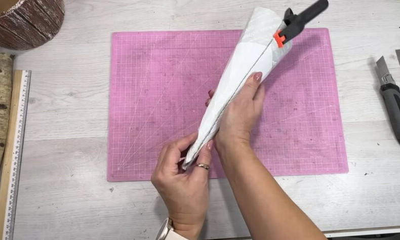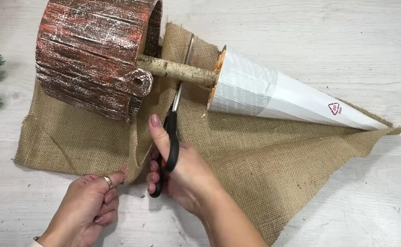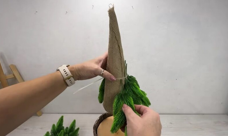Разместите первый подготовленный круг на дне вазона. Зафиксируйте ветку с конусом с помощью горячего клея, затем поместите оставшиеся круги из пеноплекса. Оберните картонный конус мешковиной. Срез припуска соберите на нитку и затяните, закрывая внутреннюю часть конуса.