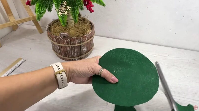 Создание уютной атмосферы в доме во время праздников – увлекательное и приятное занятие. Используя простые материалы и инструменты, можно создать поистине уникальный новогодний декор, который не купишь в магазине. Изготовление новогоднего декора своими руками — идеальное занятие для тех, кто любит заниматься рукоделием и хочет добавить в свой дом частичку домашнего тепла и уюта. Liliya DIY — Art Stories/youtube Список материалов картон; клей (горячий клей и клей ПВА); бумажные салфетки; акриловый лак; акриловая краска; спонж или поролоновая губка; пеноплекс; ветка дерева (в качестве ствола ёлки); мешковина; еловые веточки; кабельные стяжки; проволока; декоративные элементы ; фетровая подложка. Пошаговая инструкция Основание кашпо Вырежьте из картона две детали: донышко и стенку кашпо. Liliya DIY — Art Stories/youtube Дно лучше сделать двойным для большей прочности. Приклейте стенку к донышку, при необходимости слегка согните картон. Liliya DIY — Art Stories/youtube Оформление кашпо Подготовьте 14 картонных прямоугольников размером 3 см на 11 см и два прямоугольника размером 3 см на 13,5 см. У двух длинных прямоугольников слегка скруглите углы. Сделайте в заготовках сквозные отверстия радиусом примерно 1 см. Затем приклейте заготовки с отверстиями к вазону, располагая их напротив друг друга. Liliya DIY — Art Stories/youtube Оставшееся пространство обклейте короткими полосками из картона. Обклейте поверхность кашпо бумажными салфетками, сложенными гармошкой, используя акриловый лак или слегка разведенный клей ПВА. Салфетки должны слегка выступать за края кашпо, чтобы была возможность обклеить торцы и небольшую часть дна. Чтобы структура вазона была более выразительной, после высыхания первого слоя приклейте второй слой салфеток. В этот раз высота салфеток должна соответствовать высоте вазона. Liliya DIY — Art Stories/youtube После высыхания клея закрасьте поверхность вазона акриловой краской темно-коричневого цвета. С помощью спонжа или поролоновой губки добавьте краску других оттенков коричневого и белого, имитируя снег. Liliya DIY — Art Stories/youtube После высыхания краски покройте поверхность вазона акриловым лаком. Создание основания ёлочки Внутри вазона разместите круги из пеноплекса, в которых будет располагаться ствол ёлочки. Для ствола отлично подойдет красивая ветка дерева. Liliya DIY — Art Stories/youtube На тонком картоне постройте сектор круга радиусом 30 см и длиной дуги 30 см. Вырежьте сектор, добавив с одной стороны припуск 1,5 см для склеивания. Liliya DIY — Art Stories/youtube Перегните картон по линиям радиуса и сформируйте конус для основания ёлочки. Liliya DIY — Art Stories/youtube Закрепите ветку на конусе, используйте кусочки пеноплекса для дополнительной прочности. Liliya DIY — Art Stories/youtube Подготовленные круги из пеноплекса разрежьте пополам и сделайте отверстия для ствола ёлочки. Liliya DIY — Art Stories/youtube Разместите первый подготовленный круг на дне вазона. Зафиксируйте ветку с конусом с помощью горячего клея, затем поместите оставшиеся круги из пеноплекса. Оберните картонный конус мешковиной. Срез припуска соберите на нитку и затяните, закрывая внутреннюю часть конуса. Liliya DIY — Art Stories/youtube Оформление ёлочки Закрепите еловые веточки на основании с помощью кабельных стяжек. Liliya DIY — Art Stories/youtube Для завершения оформления верхней части ёлочки, закрепите на верхушке проволоку и обмотайте её шнуром. Liliya DIY — Art Stories/youtube Украсьте 