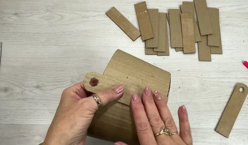 Подготовьте 14 картонных прямоугольников размером 3 см на 11 см и два прямоугольника размером 3 см на 13,5 см. У двух длинных прямоугольников слегка скруглите углы. Сделайте в заготовках сквозные отверстия радиусом примерно 1 см. Затем приклейте заготовки с отверстиями к вазону, располагая их напротив друг друга.