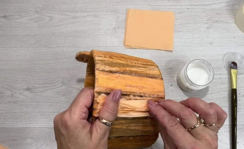 Оставшееся пространство обклейте короткими полосками из картона. Обклейте поверхность кашпо бумажными салфетками, сложенными гармошкой, используя акриловый лак или слегка разведенный клей ПВА. Салфетки должны слегка выступать за края кашпо, чтобы была возможность обклеить торцы и небольшую часть дна. Чтобы структура вазона была более выразительной, после высыхания первого слоя приклейте второй слой салфеток. В этот раз высота салфеток должна соответствовать высоте вазона.