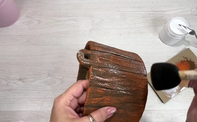 После высыхания клея закрасьте поверхность вазона акриловой краской темно-коричневого цвета. С помощью спонжа или поролоновой губки добавьте краску других оттенков коричневого и белого, имитируя снег.