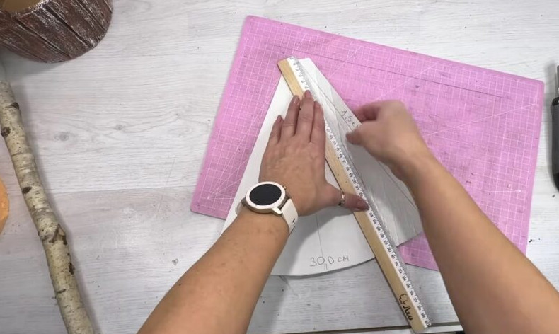 На тонком картоне постройте сектор круга радиусом 30 см и длиной дуги 30 см. Вырежьте сектор, добавив с одной стороны припуск 1,5 см для склеивания.