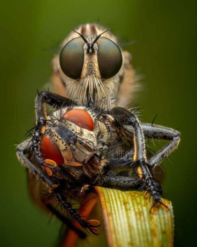 «Мухи-грабители — одни из моих любимых объектов для фотосъемки, но сделать макроснимок одной из них — непростая задача. Они довольно пугливы и в течение дня обычно улетают задолго до того, как вы сможете подойти достаточно близко для хорошего снимка. Эта особь не стала исключением. Я заметил ее в жаркий солнечный день и не смог приблизиться к ней с первых нескольких попыток. Однако я заметил, что у нее есть добыча, и поскольку я уже давно надеялся запечатлеть муху-грабителя с добычей, я решил продолжить попытки. В конце концов мне повезло, и муха позволила мне оказаться в пределах досягаемости для хорошего снимка. Но одного снимка было недостаточно — я хотел создать фокус-стекинг, чтобы убедиться, что глаза обеих мух будут резкими и в фокусе. К счастью, муха оставалась неподвижной еще несколько секунд, что позволило мне сделать этот фокус-стекинг из 24 изображений.»
