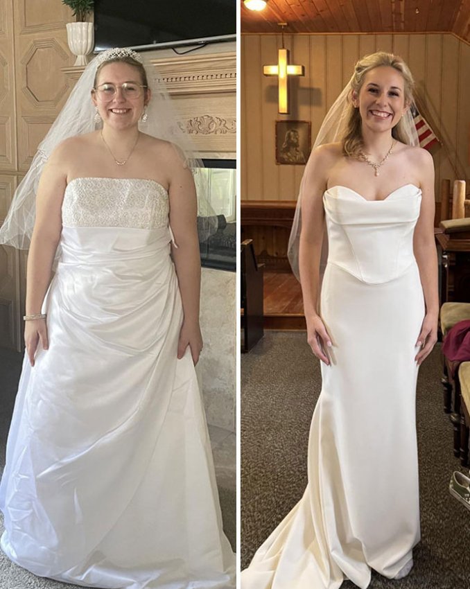 «Я начала свой путь по снижению веса в январе вскоре после того, как примерила свадебное платье моей матери и не смогла застегнуть его до конца сзади. Резко изменила свой образ жизни, чтобы стать намного более активной и есть, когда голодна, а не когда скучаю. Когда в апреле мне сняли размер и купили свадебное платье, моей швее пришлось убавить около 10 см с моей талии. Размер моего безымянного пальца также уменьшился с 8,5 до 7! Я еще не совсем закончила свой путь, но мое внимание переключилось на то, чтобы делать гораздо больше поднятия тяжестей и становиться сильнее.»