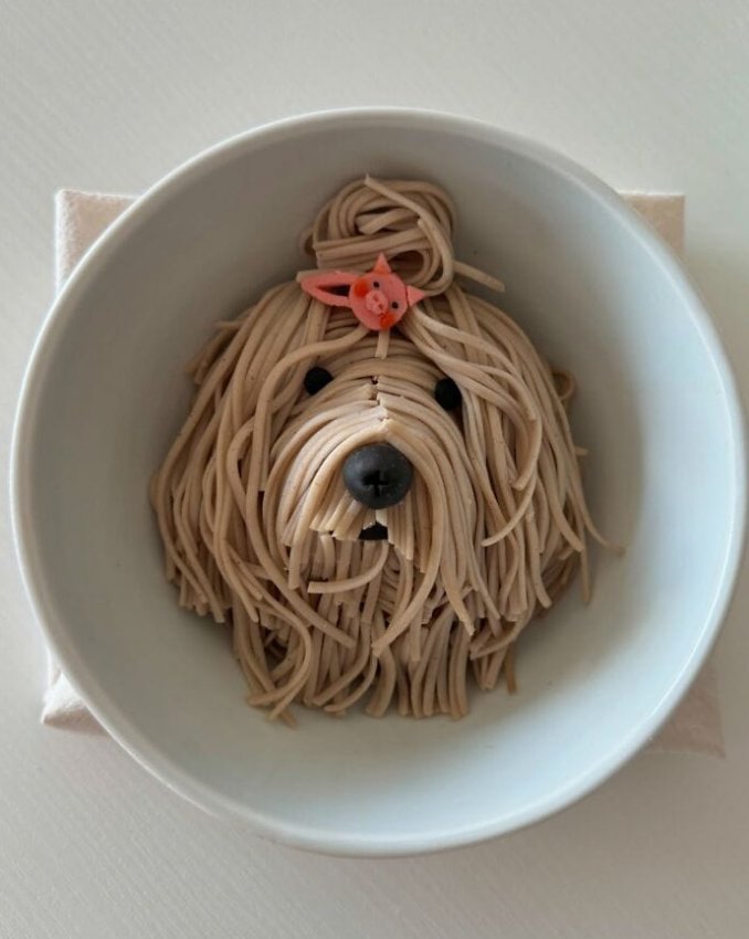 Этот шпиц из гречневой лапши явно готов завоевать титул «Лучший друг ужина». Только посмотрите на эту лапшичную чёлочку!