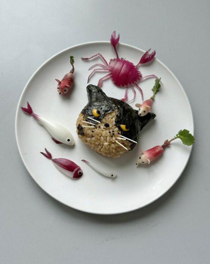 Этот кот из риса точно охотится на своих радужных рыбок. И пока вы будете любоваться композицией, кто знает — может, он кого-то уже поймал!