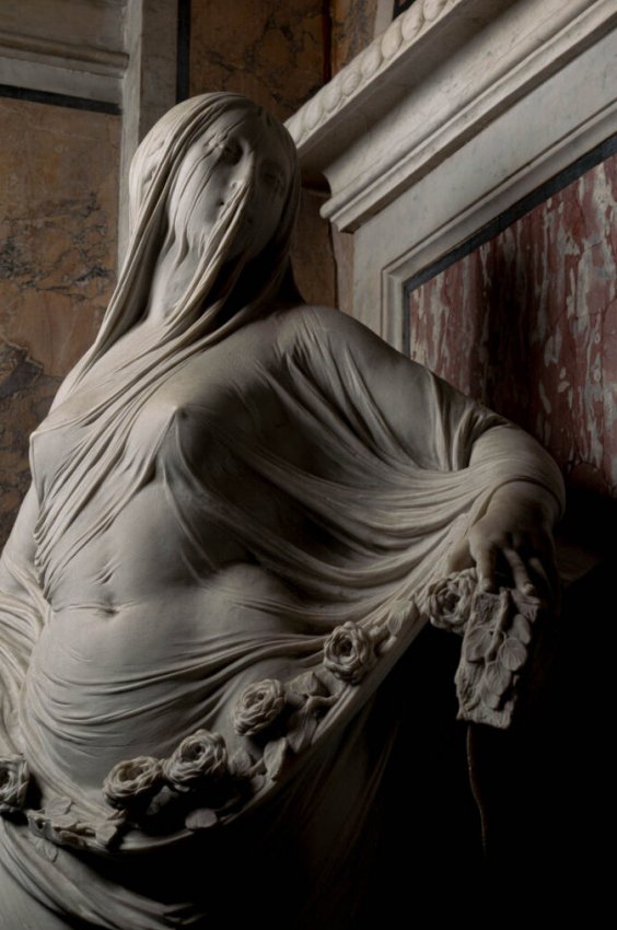 Тончайшая мраморная вуаль, сквозь которую виднеются черты лица — одна из самых узнаваемых работ мастера XVIII века.