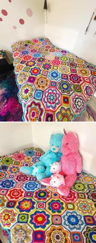 Целая вселенная цвета и узоров — на одном одеяле. Этот проект явно требует терпения святого и запаса пряжи, сравнимого с волшебным мешком Санты. Но результат — произведение искусства, в которое можно уютно завернуться.