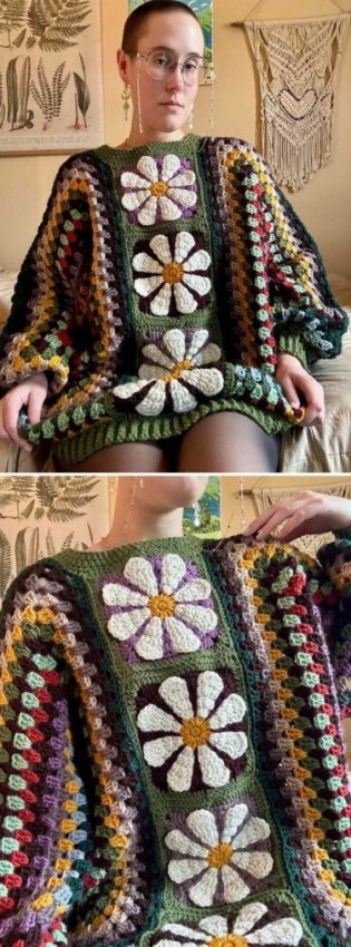 Гранж, винтаж и хиппи встретились в этом объёмном свитере с ромашками. Он выглядит как тёплое объятие любимой бабушки, но в формате модного стейтмента. Главное — не пытаться сесть на клумбу, могут перепутать!