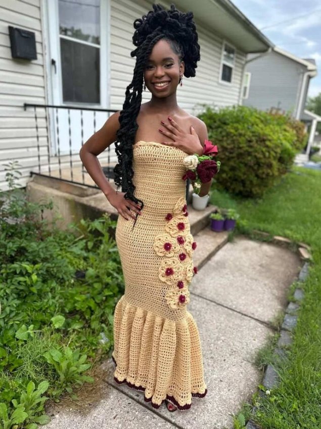 «Я начала его где-то 16 апреля и буквально закончила за несколько минут до того, как вышла вечером в день выпускного. Я вяжу крючком уже год, и я так горжусь собой и тем, как это получилось, потому что, честно говоря, в процессе я не была уверена, что получится.