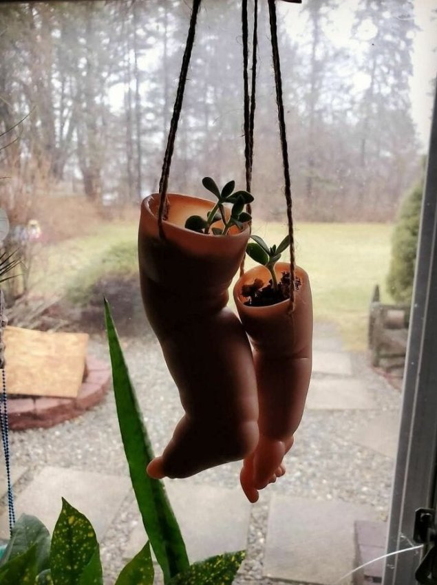 Когда цветы пускают корни в ногу, становится тревожно. Эти горшки из частей кукольных тел пугают даже закалённых цветоводов. Зато растения точно не забудут, где находятся их корни. Такой декор подойдёт тем, кто мечтает о доме с атмосферой лёгкого хоррора.