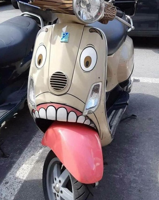 Если бы техника могла выражать эмоции, этот скутер был бы на грани нервного срыва. Его лицо кричит о страхе перед дорогой и суровой реальностью. Возможно, он просто увидел цену бензина. Или узнал, что его покраской занимался ребёнок с маркерами.