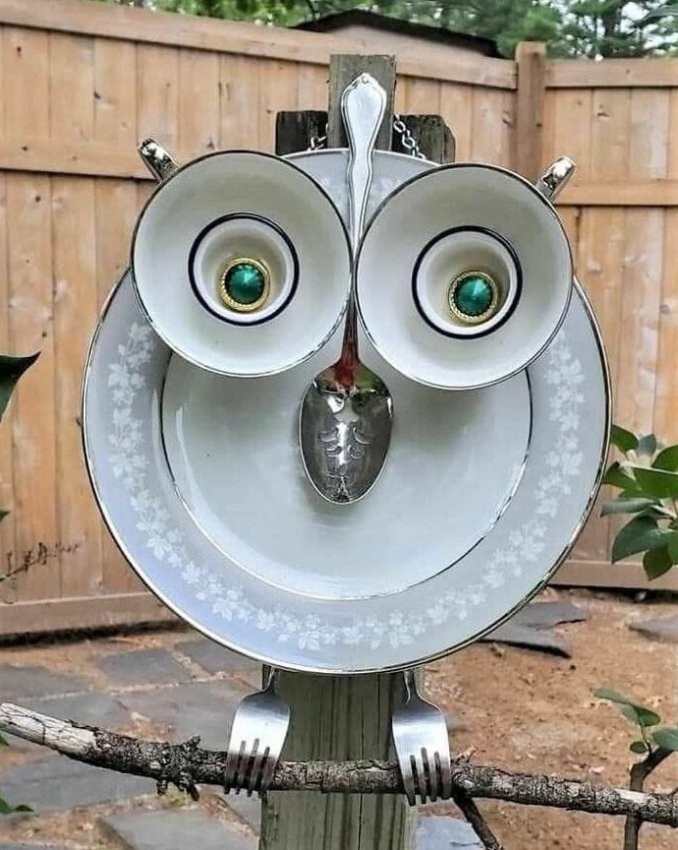 Остатки сервиза обрели вторую жизнь в виде совы, которая как будто видела слишком многое. Ложка в роли клюва придаёт композиции не только лицо, но и зловещую атмосферу. Это не просто декор, а полноценный наблюдатель сада. Каждый взгляд в её сторону вызывает лёгкое чувство тревоги.