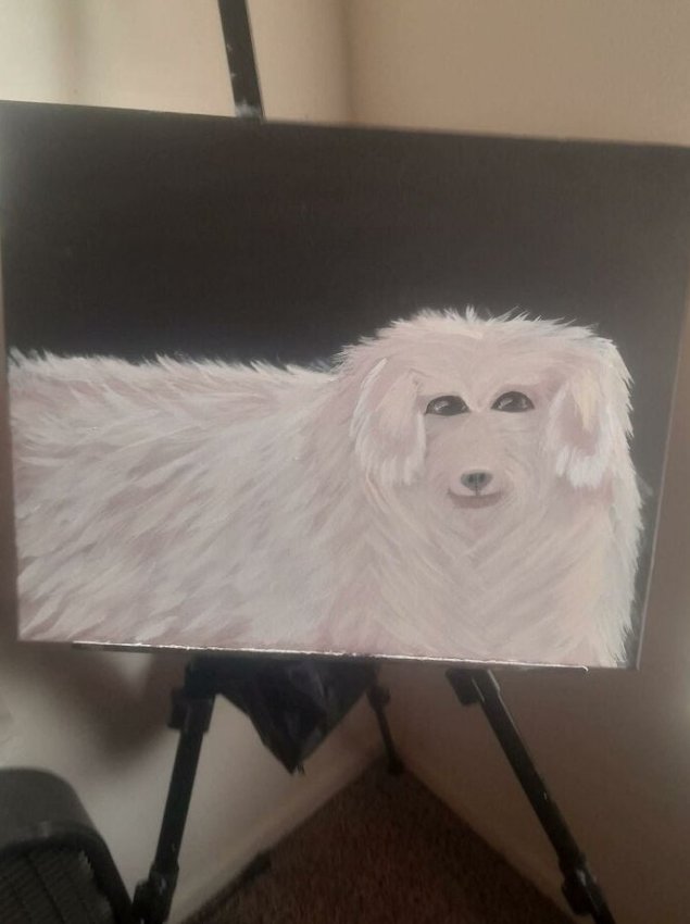 С первого взгляда понять, кто изображён на этом холсте, довольно сложно — возможно, это пес, а может, облако с глазами. Художник явно старался передать пушистость, но что-то пошло не так с анатомией. Глаза животного смотрят в пустоту, взывая о спасении. Картина вызывает эмоции, но не те, на которые обычно рассчитывают.