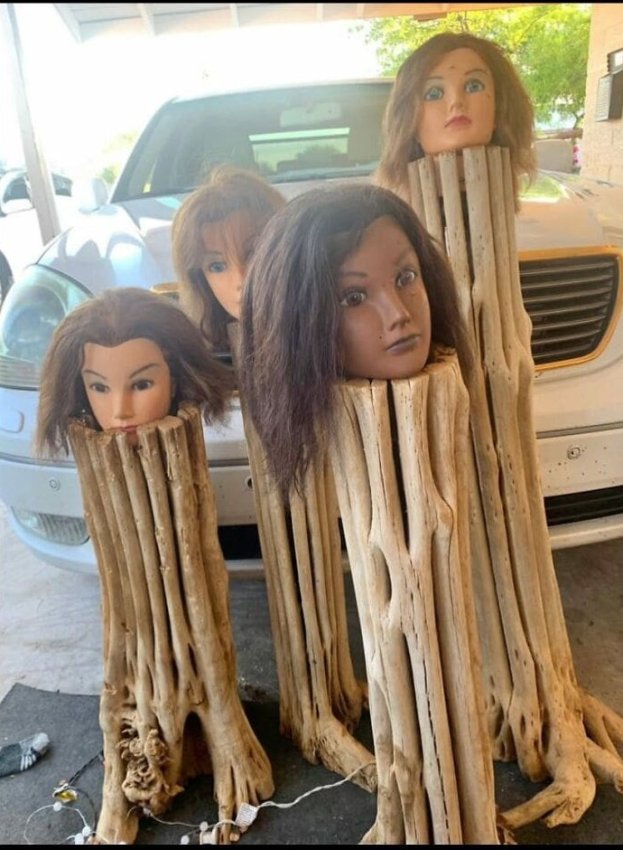 Композиция напоминает кадр из дешёвого фильма ужасов, снятого без сценария и здравого смысла. Головы манекенов выглядят так, будто вынырнули из деревьев, чтобы сообщить плохие новости. Всё вместе это похоже на арт-объект, который не должен был существовать. Странно, тревожно и совершенно необъяснимо.