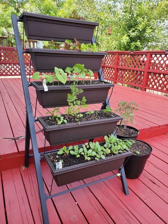 «У меня она уже несколько месяцев, и я вполне довольна. Я обнаружила, что на каждом ярусе есть немного тени, поэтому растения в задней части ящика наклоняются вперед, но я довольна тем, сколько я могу вырастить.»