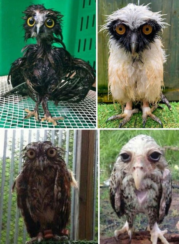 К сожалению, в отличие от уток, совы не водоотталкивающие! Вот как они выглядят, если попадут под дождь