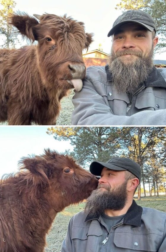 Эта корова явно пытается объяснить человеку, почему он должен бросить всё и отправиться с ней пастись на лугу. Судя по его реакции, аргументы были очень убедительны. Когда у вас такой харизматичный лучший друг, сопротивляться бесполезно!