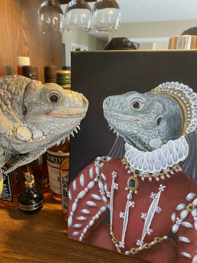 Когда просишь художника нарисовать тебя как знатную даму эпохи Возрождения, а он воспринимает твою просьбу слишком буквально. Теперь у этой ящерицы есть собственный парадный портрет, и она не уверена, как относиться к результату. Но искусство требует жертв!