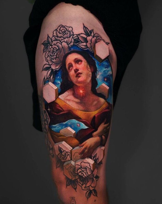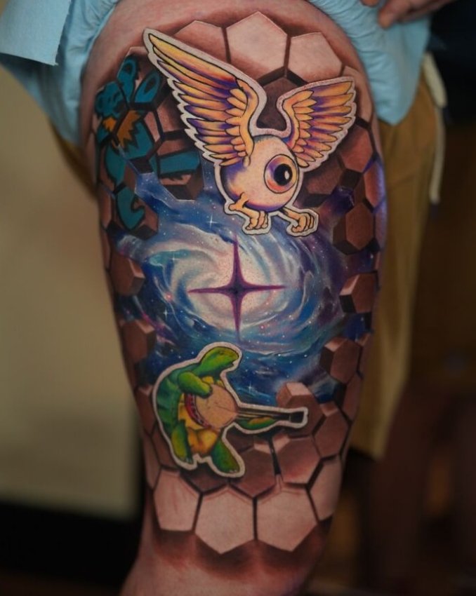 Кто-то попросил «сделай мне вселенную на бедре», и Джесси не подвёл. Здесь есть всё: портал в космос, черепаха с банджо и крылатый глаз, который явно знает больше, чем говорит. Смотришь — и не можешь понять, это тату или квест на психоделике.