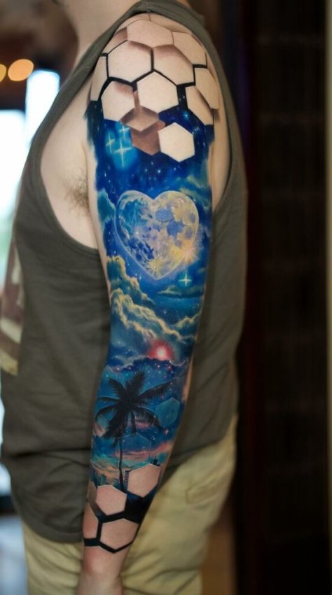 На руке этого человека романтика, космос и пальмы встретились в одном закате. Луна в форме сердца сияет на фоне неба цвета мечты. А гексагоны — как напоминание: даже влюблённость должна быть хорошо выровнена по краям.