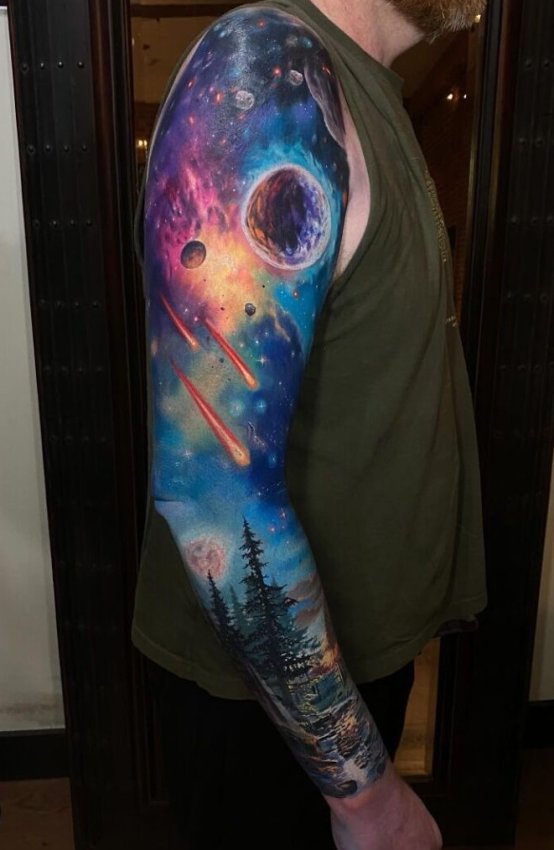 На этом предплечье не просто татуировка, а сбой в коде Вселенной. Как будто кто-то удалил текстуры, и под кожей — чистый космос. Осторожно: можно засосать обратно в галактическую версию себя.