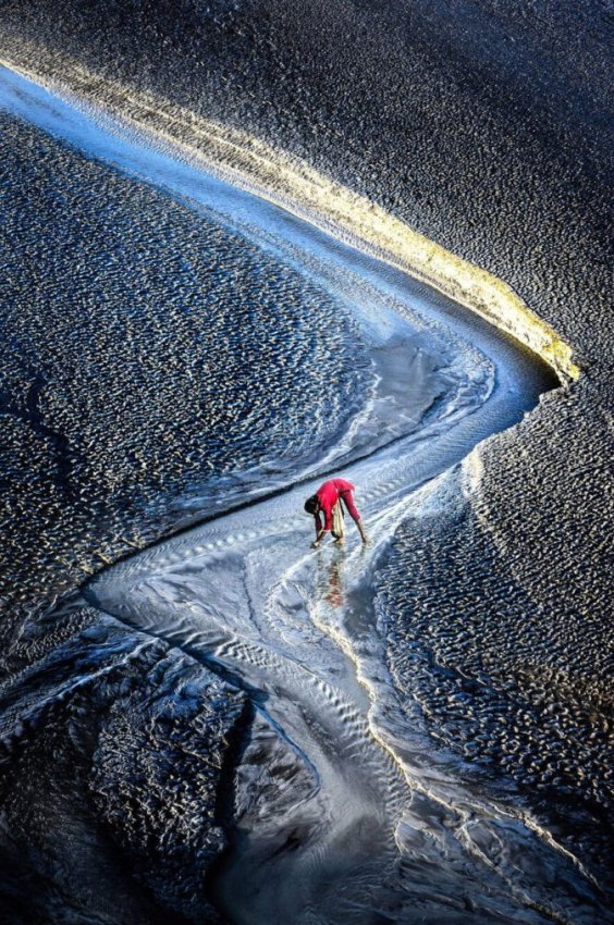 Этот человек кажется песчинкой в бескрайнем водном узоре. Его силуэт, согнувшийся над водой, идеально вписывается в изгибы песчаных линий. Иногда природа словно рисует картины, где человек становится всего лишь штрихом на её полотне.