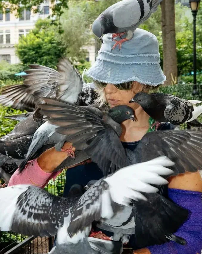 Шляпа стала посадочной полосой, рука — ложей, а хозяйка — строгим смотрителем пернатого театра. Тут и вихри крыльев, и шуршание перьев — полный эффект присутствия. Корм — их билет, терпение — её superpower. Кадр пахнет хлебными крошками и дружбой.