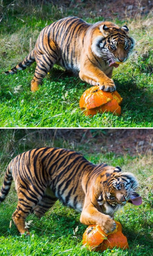 Большой полосатый кот официально признал Хэллоуин своим. Тыква сдаётся, язык празднует победу. Игрушка — на запчасти, настроение — на весь день.
