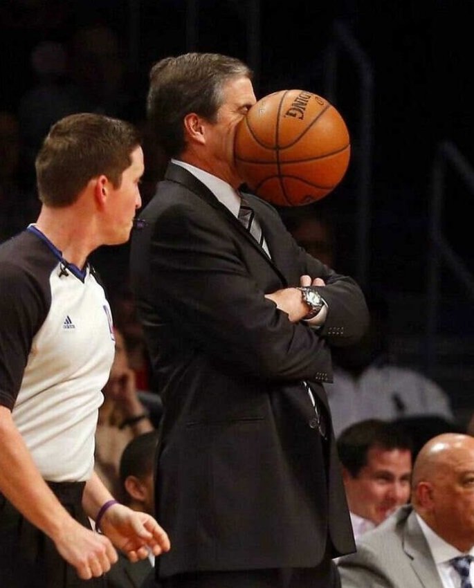 Иногда мяч не в корзине, а прямо в лицо. И в этот момент вся уверенность, поза и строгий вид тренера превращаются в комичный кадр. Кажется, что ему только что прилетел самый неожиданный «тайм-аут».