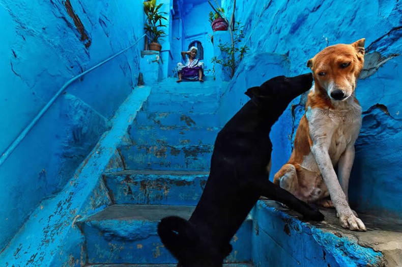 В переулке, где стены почти цвет неба, чёрный пёс делится новостями у уха рыжего. Тот делает вид, что ему всё равно — но уши выдают интерес. Наверху зритель в ярком наряде наблюдает уличной театр. Краска облупилась, а настроение осталось насыщенно-синим.