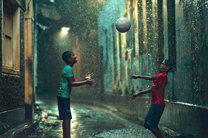 Мяч подбрасывает небо, а тысячи капель хлопают как болельщики. Двор превращается в стадион со скользкими кулисами и мокрыми улыбками. Ворота — стены, судья — гром, но финального свистка никто не ждёт. Детство не промокает — оно сверкает лужами.