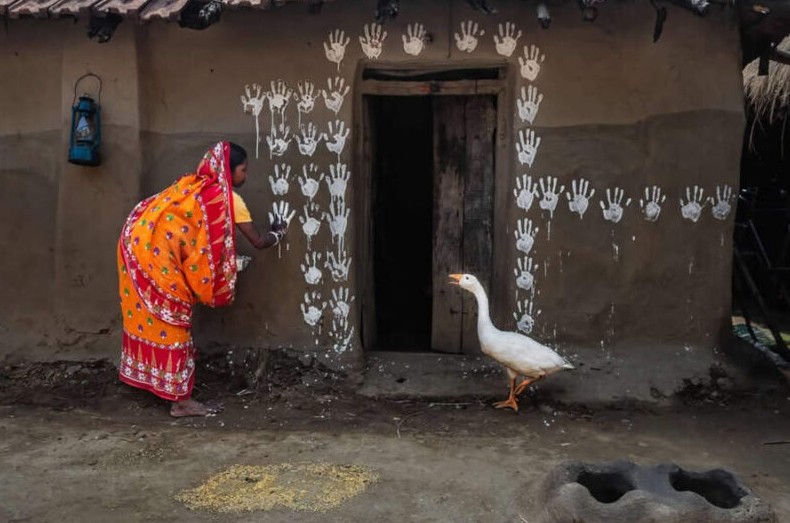 Белые ладони на стене — не граффити, а домашний герб, только что снятый с формы. Женщина в оранжевом выводит новый ряд, а гусь внимательно принимает работу. Дворовые хроники пишутся краской и привычкой. Даже лампа на стене знает расписание росписей.