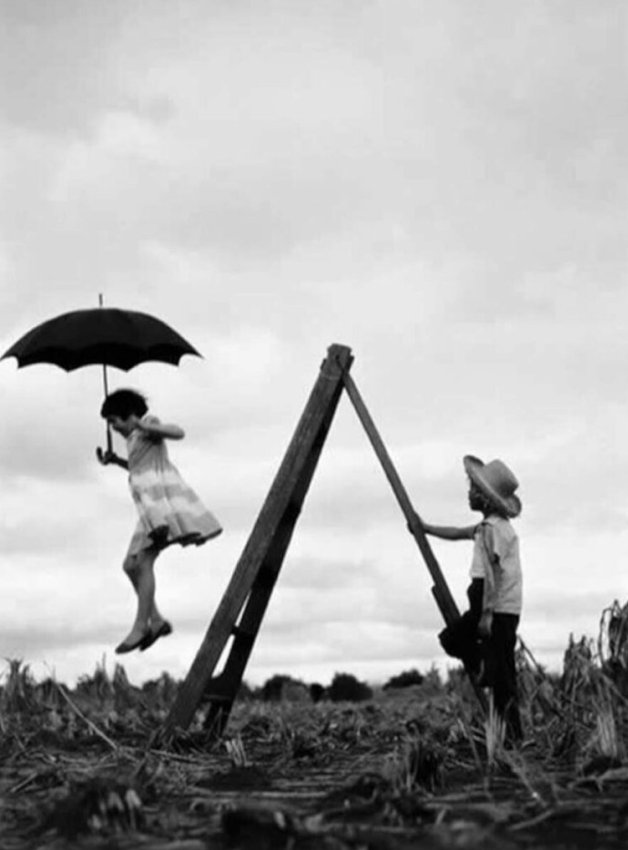 Лестница — стартовая вышка, зонтик — сертификат пилота. Девочка делает шаг в воздух так уверенно, будто облака подписали договор о дружбе. Мальчик держит трап и считает секунды. Ветер выдает печать «разрешено радоваться».