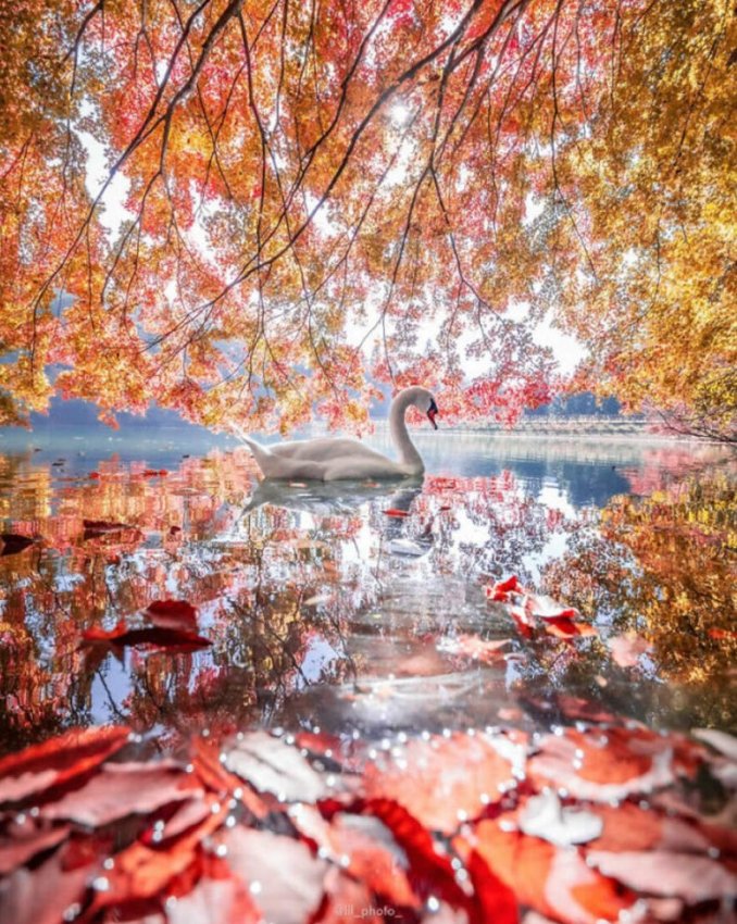 Осень рассыпала по воде красные конфетти и повесила над озером золотую кулису. Белый лебедь скользит, как одиночная нота по длинной струне тишины. Зеркало отражений делает кадр вдвое щедрее. Балет без музыки, где дирижёр — свет.