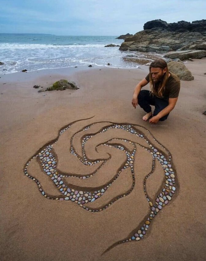 Есть художники, которые спорят с природой, а есть Джон Форман — он с ней договаривается. Пляж становится мастерской, ветер — ассистентом, а первые попавшиеся камни — палитрой, где вместо красок — оттенки моря и времени. В его руках галька строится в орбиты, листья превращаются в стрелки компаса, и внезапно берег начинает говорить на языке геометрии.
