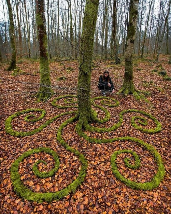Мох превращён в рукопись, которую понимают только деревья и дождь. Спирали будто «растут» из ствола и расползаются по листовой подстилке, как шёпот. Хочется ступить внутрь — и боишься нарушить орфографию леса.