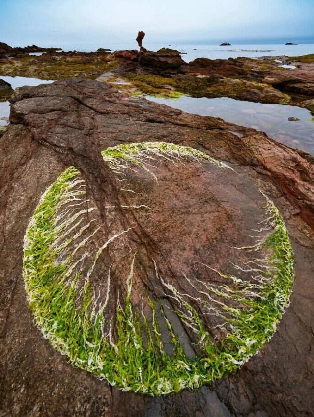 Зелёные водоросли и белоснежные нити-сросшиеся корни образуют сияющий полумесяц. Скала становится небом, по которому растёт лунный свет. Прилив — единственный ластик, допущенный к этому рисунку.