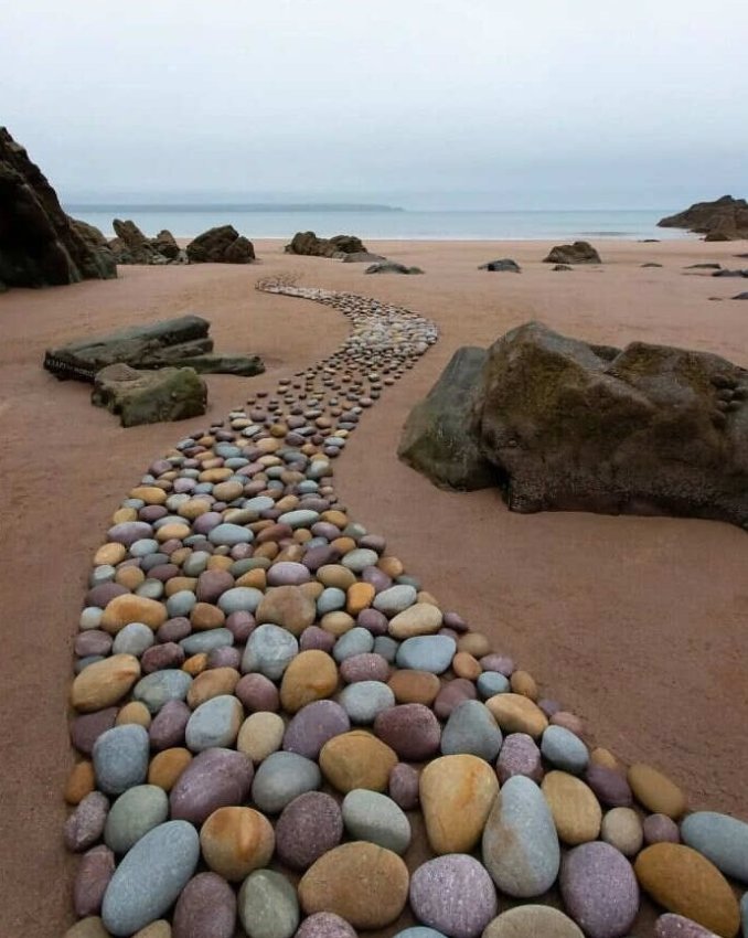 Пёстрый поток камней уходит к линии горизонта, где его встретит настоящая вода. Русло придумано человеком, но течёт по нему взгляд. Дорожка, по которой гуляют мысли.