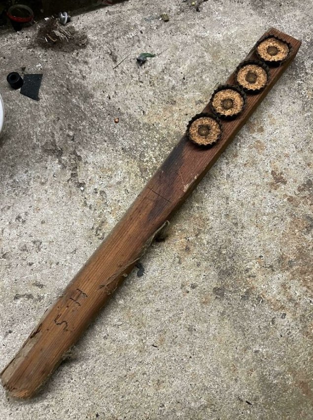 Кусок дерева с четырьмя прибитыми к нему крышками от бутылок, внутри которых, похоже, пробки. Найден в стенах моего гаража