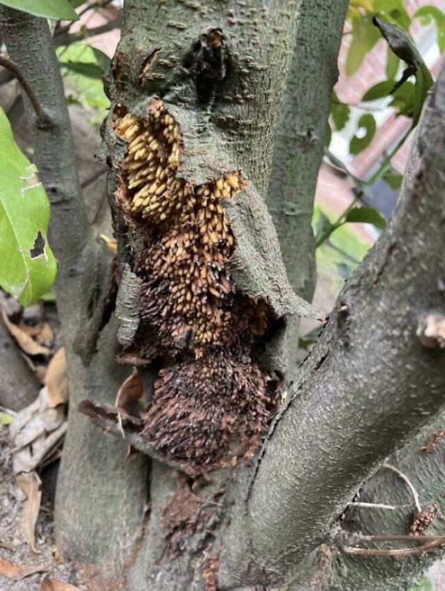 Кажется, дерево расстегнуло куртку коры, и изнутри посыпались «рисинки». Шипастые кисточки торчат плотными гроздьями, как мини-ёжики на свидании. Смотришь ближе — и узор начинает шевелиться в воображении. Любителям ровных поверхностей лучше моргнуть дважды.