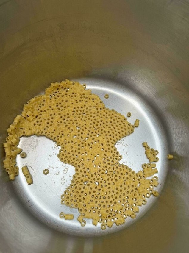 Макароны устроили строевую на дне кастрюли и выложили идеальный ковер. Похоже на крошечные спасательные круги, застывшие в ожидании кипятка. Пастафары бы одобрили такую дисциплину. Ещё секунда — и орнамент растворится в бурлении.