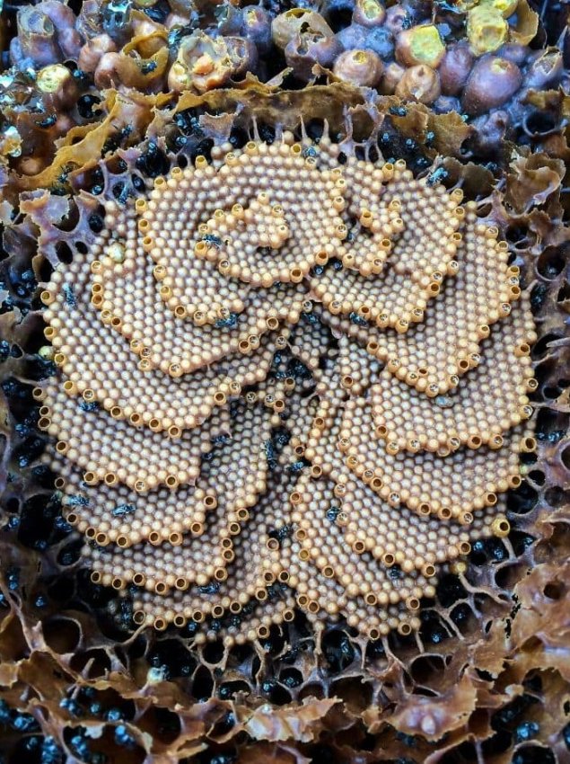 Кусок сот будто превратили в легкую вафельную скульптуру. Края съедены пространством, внутри — арки и мостики из воска. Выглядит хрупко, но держит форму, как миниатюрная пчелиная крепость. Потрясающая геометрия, собранная из шестиугольников и воздуха.