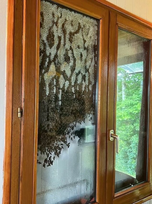 Пчёлы сделали шторы из сот — дизайн с медовым подтоном. За стеклом тихо гудит и работает маленький город. С таким «витражом» утренний свет становится липко-тёплым. Остаётся решить, кто здесь на кого смотрит.