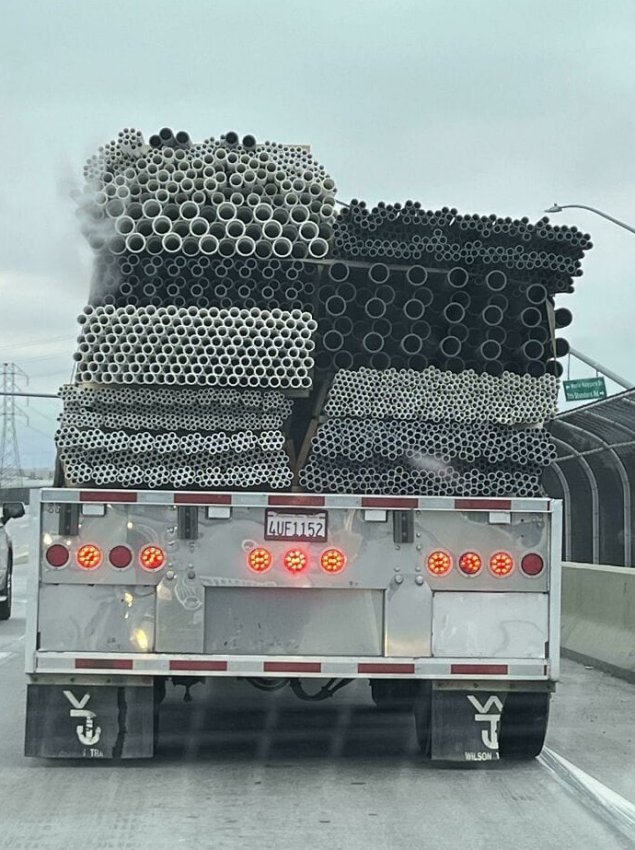 Грузовик везёт гипноз оптом: соты из труб уходят в глубину правильными кругами. Взгляд цепляется за каждое отверстие и пытается сложить идеальную симметрию. Ехать позади — как смотреть скринсейвер в реальном мире. Медитативно и немного тревожно.