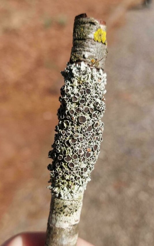 Палочка в «обручальных кольцах» лишайника — мини-галерея рамок. Светлые края и тёмные центры складываются в мозаику крошечных глазков. Чем дольше всматриваешься, тем больше слоёв и форм. Природа явно любит повторения.