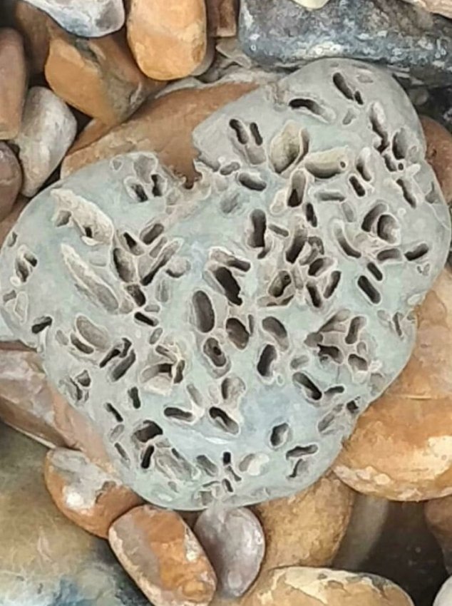 Камень с тоннелями времени — будто кусок коралла, забытый на берегу. Внутри лабиринт карманов, арок и ниш. Рисунок кажется случайным, но повторяется с удивительной логикой. Текстура, которая просит макросъёмку.