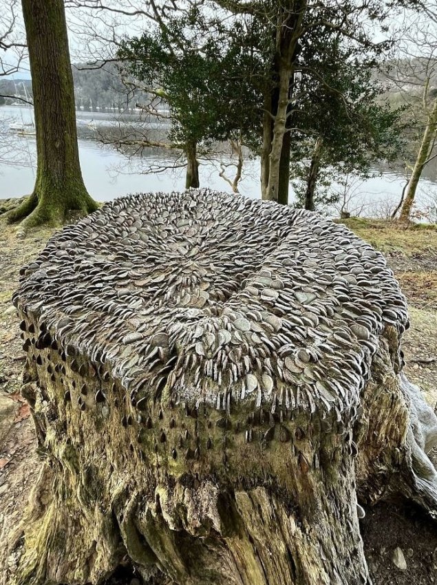 Пень-желание, усыпанный монетами, как металлическая чешуя. Сверху — круговые «волны», по бокам — капли-«гвоздики». Люди добавляют свои кружочки — природа покрывает их патиной. В итоге получается скульптура из маленьких надежд.